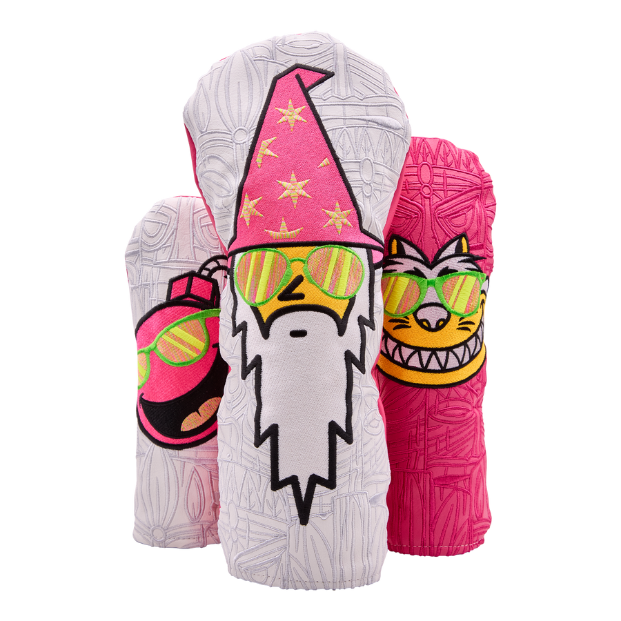 Our Sunglasses icons are soaking up the good vibes in Tikiland! This fun wood set includes the Sunglasses Wizard on a crisp white driver cover, the Sunglasses Cat chilling on a pink 3-wood cover, and the Sunglasses Bomb completing the lineup on a white hybrid cover. Each piece features Bettinardi and the iconic B on the back, combining tropical style with top-notch club protection. Limit 1 per person. Good luck!