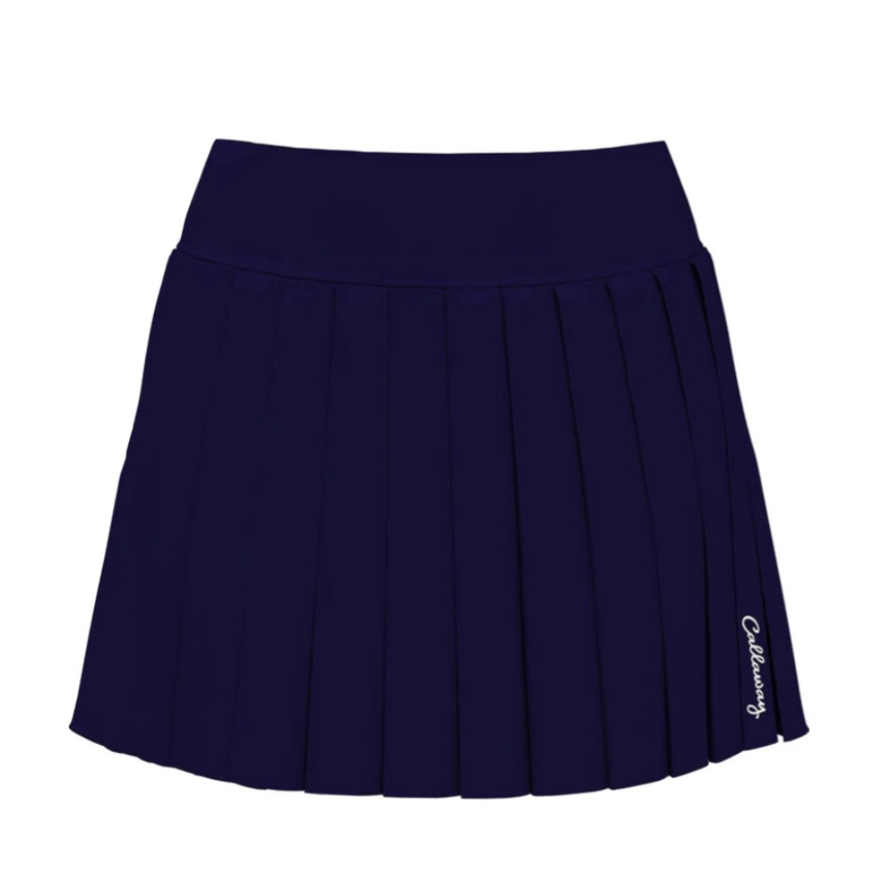 This Callaway Apparel's 16" High Waist Solid Skort with Pleats is a stylish and functional choice for the golf course. Designed for performance, it features a comfortable and stretchy 90% polyester/10% elastane plainweave fabric that allows for a full range of motion during your swing. Callaway's Opti•Dri™ technology wicks away moisture to keep you dry and comfortable, while TrueSculpt technology provides a smoothing and flattering silhouette. The classic solid color and pleated design offer a timeless look that pairs perfectly with any golf top.