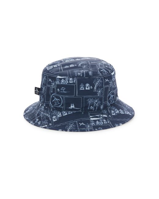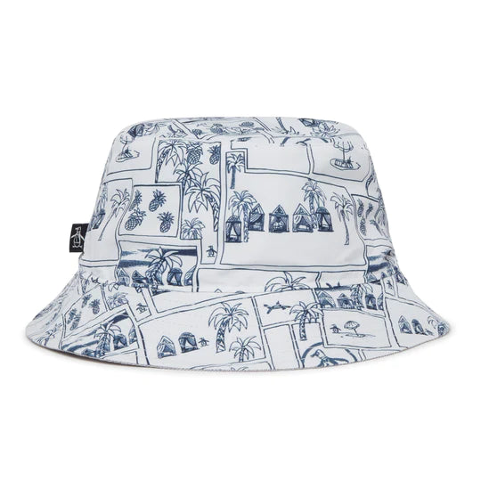 Mens Original Penguin Golf Vacation Pete Reversible Bucket Hat. A fitted, reversible bucket hat with a printed graphic one side and Pete branding to the other.