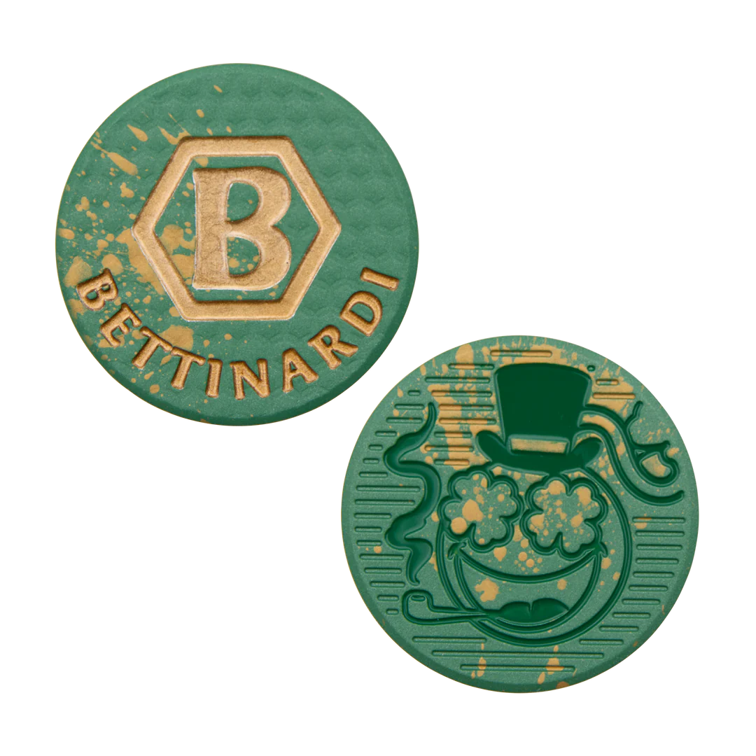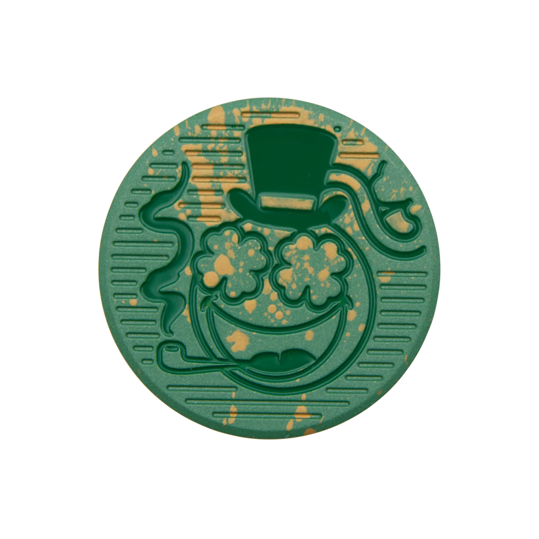 Ah, luck be with ya on the greens with this Green and Gold Splatter Ball Marker! Featuring our Clover Eyes Bomb on one side and a polished Hex B and Bettinardi over Micro Honeycomb™ milling on the other, this fine piece was milled and painted with a wee bit o’ magic at our Tinley Park, IL headquarters. But don’t be dilly-dallyin’—limited quantities are available, and it’s one per lucky golfer! Snag yours before it disappears like a pot o’ gold!