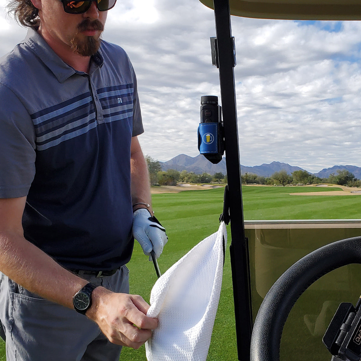 The ultimate grab-n-go golf towel, designed to go with you from tee to green, measures 29" x 29", and folds/hangs 29" x 13".